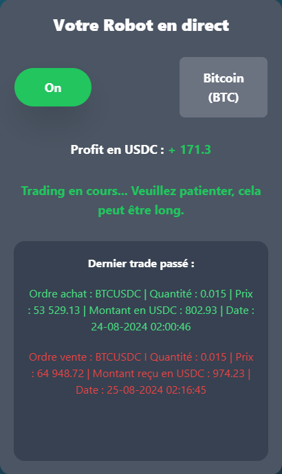 Grâce à un algorithme intelligent, notre robot identifie les meilleures opportunités de marché. De plus, il ne vend pas tant qu'il n'y a pas de profit. 🤖